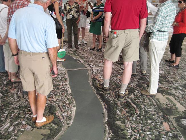 proud of the many floods it has endured over the years -- here's our guide in front of a marker.