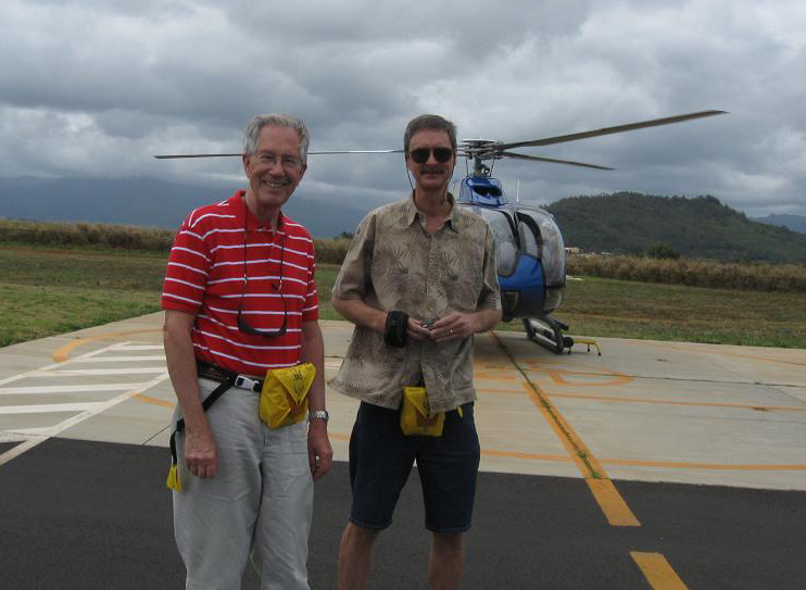 A high point of the week for Blake and Mike was a helicopter tour of the entire island. Here they are at the heliport, with some scenes from the air: looking at one of the big waterfalls in Waimea Canyon, an NCL cruise ship at the dock, and an aerial view of the road-less Napali coast. | |||