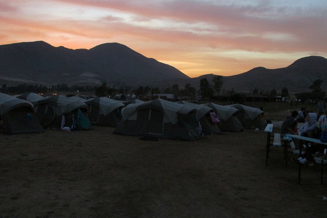 At the Base Camp each day, we cleaned up and enjoyed really good food (here's the line for dinner). Sunset was behind the mountains, where our building sites were located, and the next morning at 6am, we were all up and at it for another day. | |||