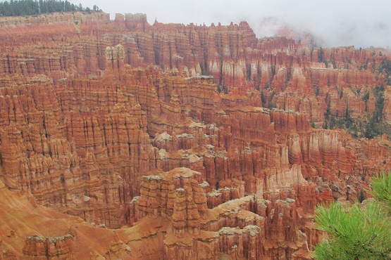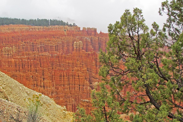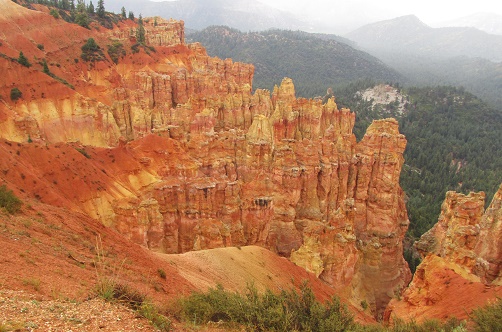 | Our route next took us along Utah Highway 12, which many guidebooks label as "the most beautiful road in the United States." It features one curve after another, each with even more amazing views. Bryce Canyon National Park was next, but alas, rain and fog made seeing anything impossible. We watched the visitor center movie, and did some laundry, vowing to try again the next morning. Luck was with us, as the fog lifted enough for us to take in the most of the sights. Bryce Canyon is another mis-named National Park, consisting not of a canyon at all, but a collection of giant natural amphitheaters. The Park contains some of the earth's most colorful rocks, sculpted into vertical pillars called hoodoos. | |||