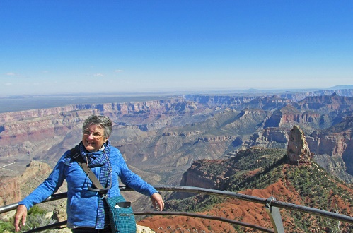 | Sure you've been to the Grand Canyon -- practically everybody has. But 90% of visitors go to the South Rim , which is easy to get to and has lots of tourist facilities. But the North Rim is convenient to reach from Utah, and has the same stunning vistas, trails, mule rides, etc. as the South Rim -- and few crowds! We were stunned when we woke up to find the forecasted rain storm had turned into snow! Luckily, the temperature rose to an almost balmy 50 degrees, and the snow rapidly melted, allowing us to enjoy the Grand Canyon views. At one point on the rim, you can see the Colorado River about a thousand feet below. | |||
