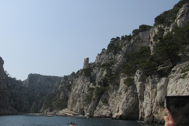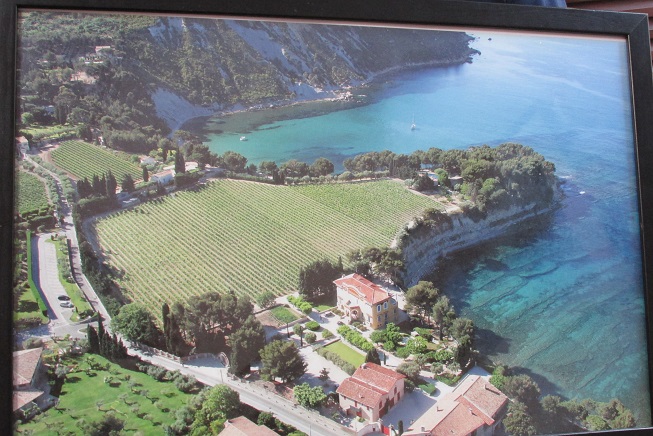 France is famous for various things, one of them being labor strikes, so our visit to Marseille, France's largest port, was changed to a visit to nearby Sanary-sur-mer. This turned out for the better, as it's a beautiful small port. Here's our ship at anchor in the harbor, an aerial view of the winery overlooking the ocean - we visited here to learn about the kinds of wine produced in the south of France and to admire the ocean views, not just for the wine tasting! We also took a little excursion boat out to see some of the limestone cliff "calanques," which seem to be southern France's answer to Norway's fjords. | |||