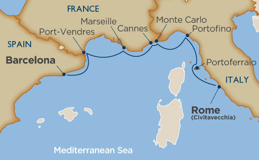 The travel group from Mike and Sandy's Church in Danville is on the go again, this time in the western Mediterranean on the Wind Surf, a "sailing yacht" carrying 312 guests. Here's our route, and the ship. It's ads say it "occasionally" puts up its sails, but on this trip, it did every day, at least for a while . | |||