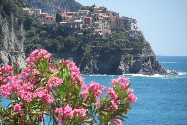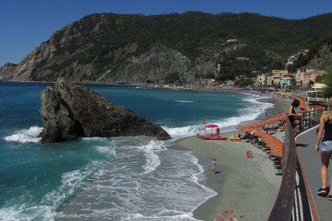 Heading northwest, the tourists took off for the Cinque Terre ("Five Lands") region on the west coast, making a brief stop on the way at Lucca, famous for its 500-year old city walls, still completely intact around the "Old Town." The 5 villages of the Cinque Terre (taken together, a UNESCO World Heritage site) are basically holiday towns along the rugged coast, some right on the water, and some high on the cliff side. The towns are connected by train, hiking trails, and boats. This is the view in front of Mike & Sandy's hotel in Monterosso, and a view of Vernazza, just down the coast a little ways. The last day saw Mike and Roland brave one of the over-the-mountain hiking trails between these two towns -- not for the weak or faint-hearted, but they made it! | |||