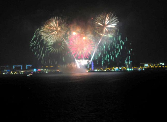 view of an international competition of fireworks teams along the waterfront.